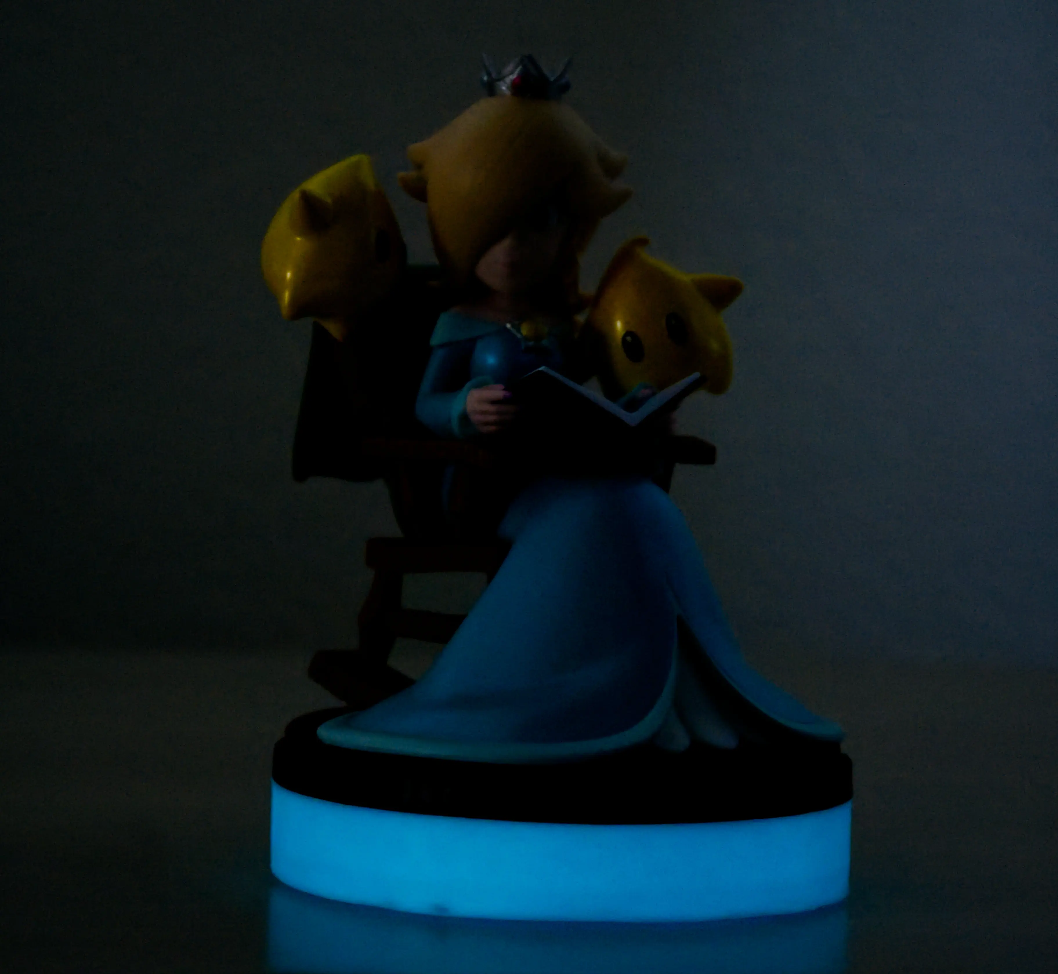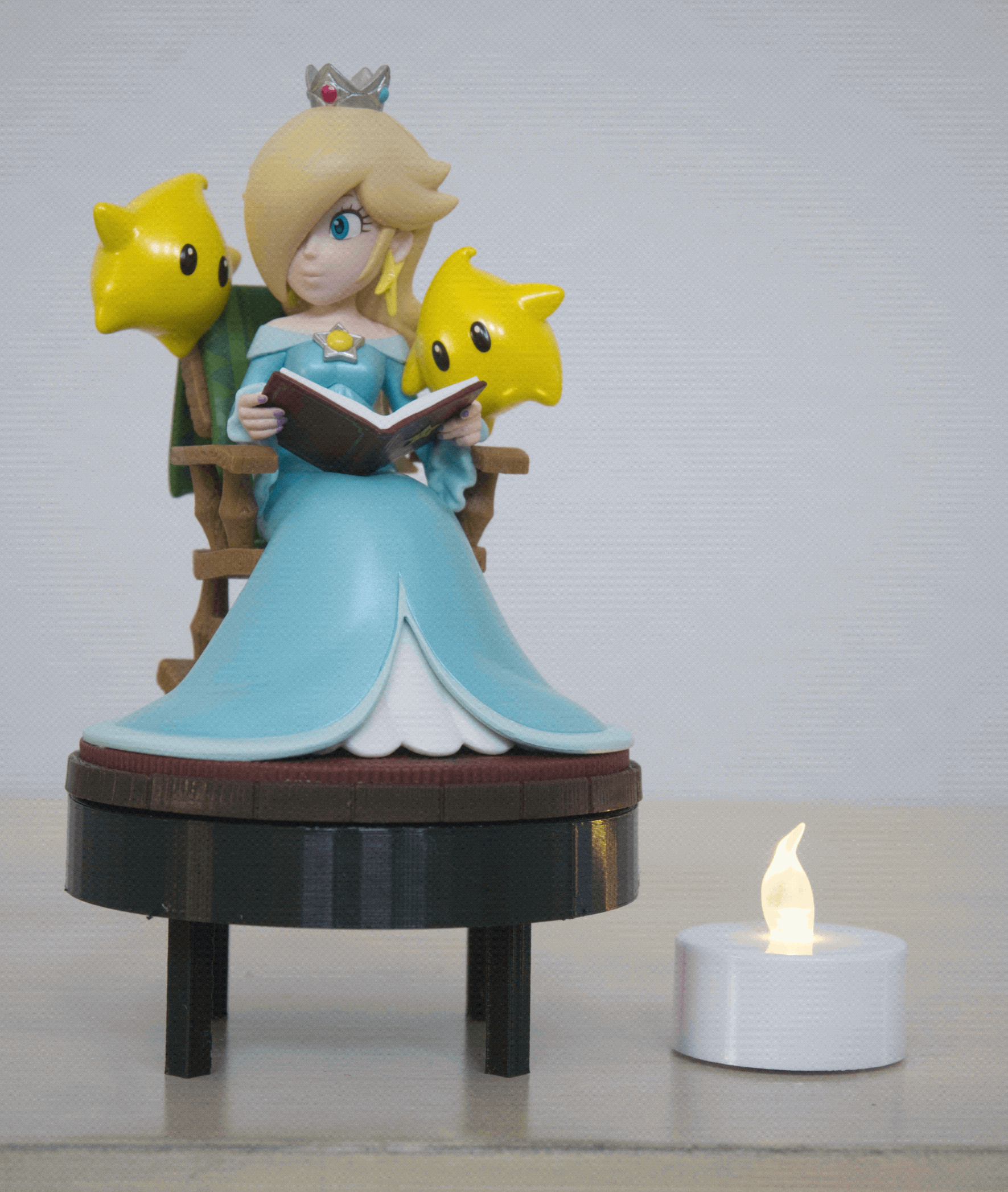 My original design was to print an elevated stand that could fit an LED light source underneath. Then, a skirt would be placed around the original print to hide the light source. The hope was to allow for some ambient light to hit the figures, which would help all the details come out even in a dark room. Some warm light would also add to the library aesthetic of the Rosalina and Lumas amiibo.1 This didn’t work as well as I was hoping, as the LED candle I was hoping to use wasn’t bright enough for the task at hand. I also couldn’t find a battery-powered light source that fit the dimensions while also being bright enough. In hindsight, I should’ve printed using white filament to better reflect the light outwards, but I ultimately went in a different direction.