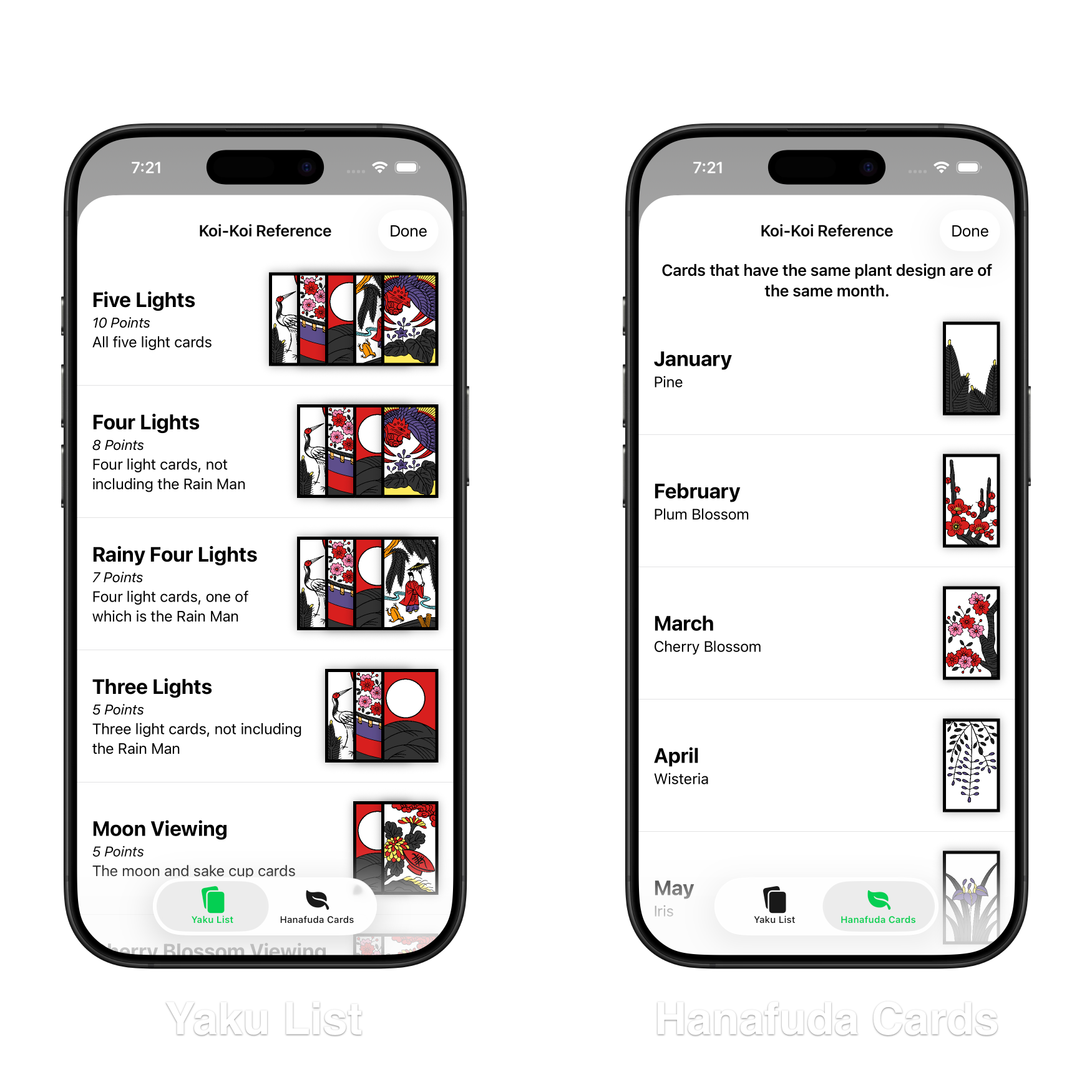 Next, I had to design a reference for Koi-Koi. This isn’t as simple as the poker hand reference because Koi-Koi generally requires two references: the “Yaku List” (similar to a poker hands list) and a reference for the cards themselves. This second reference exists because Hanafuda cards are matched by month, not suit. Each month has a plant design that isn’t obvious at first glance, especially for new players. The two reference views are split across a TabView. Special consideration had to be given to both memory and screen real estate for these views.