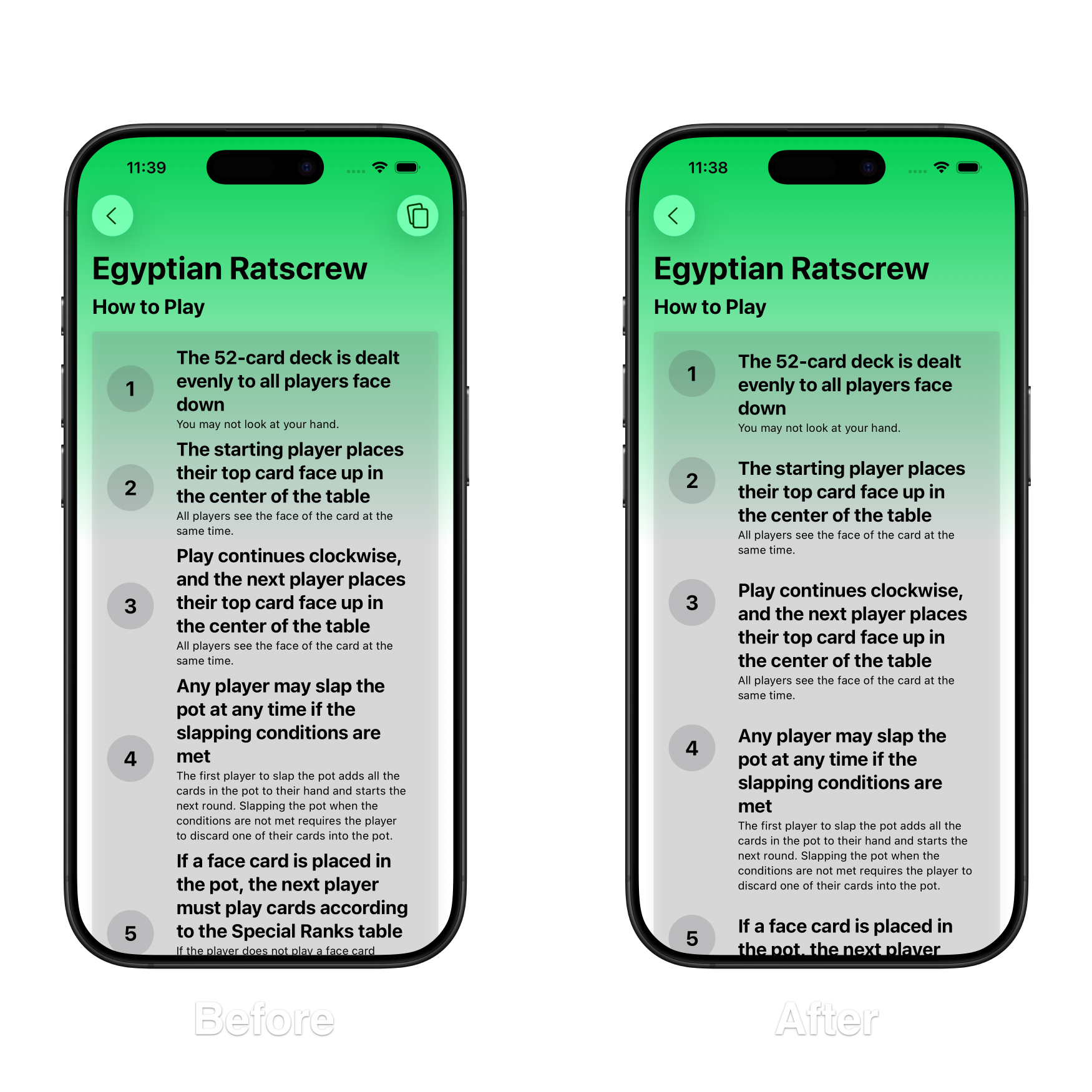 Once Egyptian Ratscrew was added to the lineup, a small issue was made much more noticeable. The step marker and the instructions themselves always attempt to align themselves vertically with each other, which becomes a problem with steps with lots of text. It makes it difficult to tell where one step ends and another begins. Egyptian Ratscrew was the first game to feature longer text, but Koi-Koi also exhibited this issue.