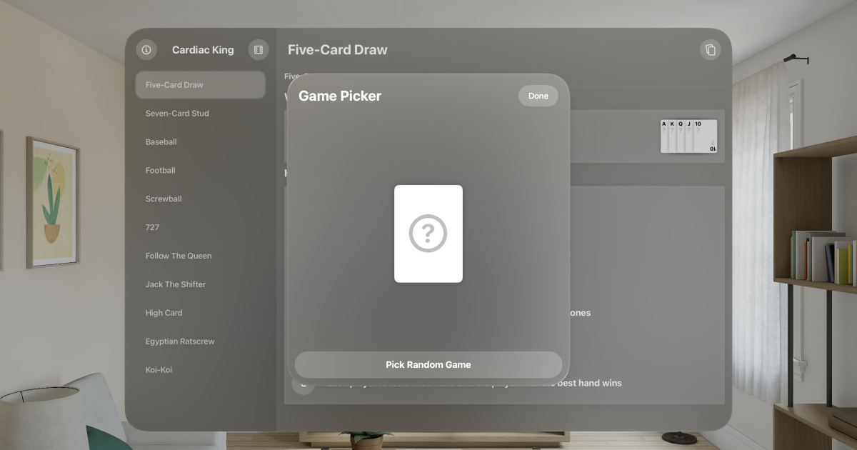 Cardiac King for iOS received the game picker functionality in version 1.1, but a visual bug prevented adding it to the visionOS version of the app. That is no longer the case in version 1.4 and visionOS once again has feature parity with iOS.